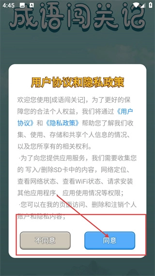 1、打開成語(yǔ)闖關(guān)記應(yīng)用后,先仔細(xì)閱讀用戶協(xié)議與隱私政策,確認(rèn)無(wú)誤后點(diǎn)擊“同意”按鈕,即可進(jìn)入應(yīng)用的主界面。