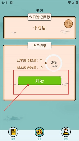 3、在速記頁(yè)面,點(diǎn)擊“開始”按鈕,啟動(dòng)今日成語(yǔ)速記任務(wù),推進(jìn)學(xué)習(xí)進(jìn)度。