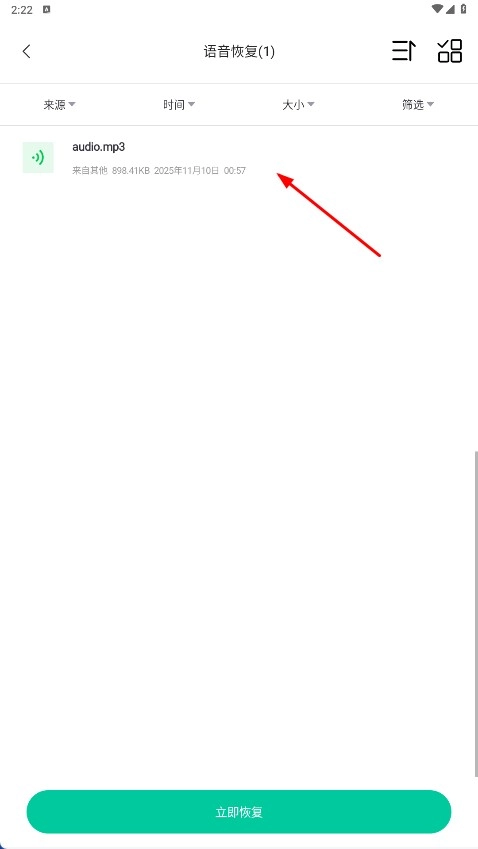 2、在語音恢復(fù)頁面,找到如【audio.mp3-語音文件】,點(diǎn)擊可查看詳情。