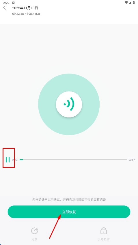 3、進(jìn)入語音詳情頁,可播放語音并點(diǎn)擊【立即恢復(fù)-功能按鈕】恢復(fù)語音。