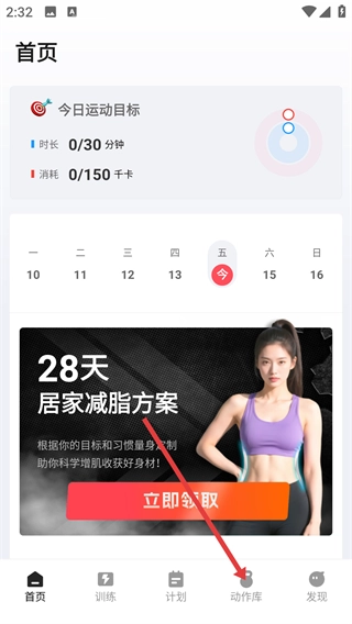 1、在首頁點(diǎn)擊底部的【動作庫】選項(xiàng),進(jìn)入動作庫頁面后,就能瀏覽各類健身動作的分類以及具體的動作內(nèi)容。
