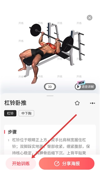 2、在動作庫中選擇目標(biāo)動作(如【杠鈴臥推】),進(jìn)入該動作的詳情頁面。