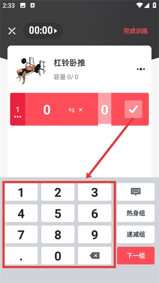 4、在訓(xùn)練記錄頁面,通過數(shù)字鍵盤輸入訓(xùn)練重量、次數(shù)等數(shù)據(jù),完成訓(xùn)練記錄操作。