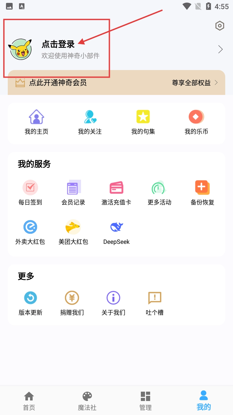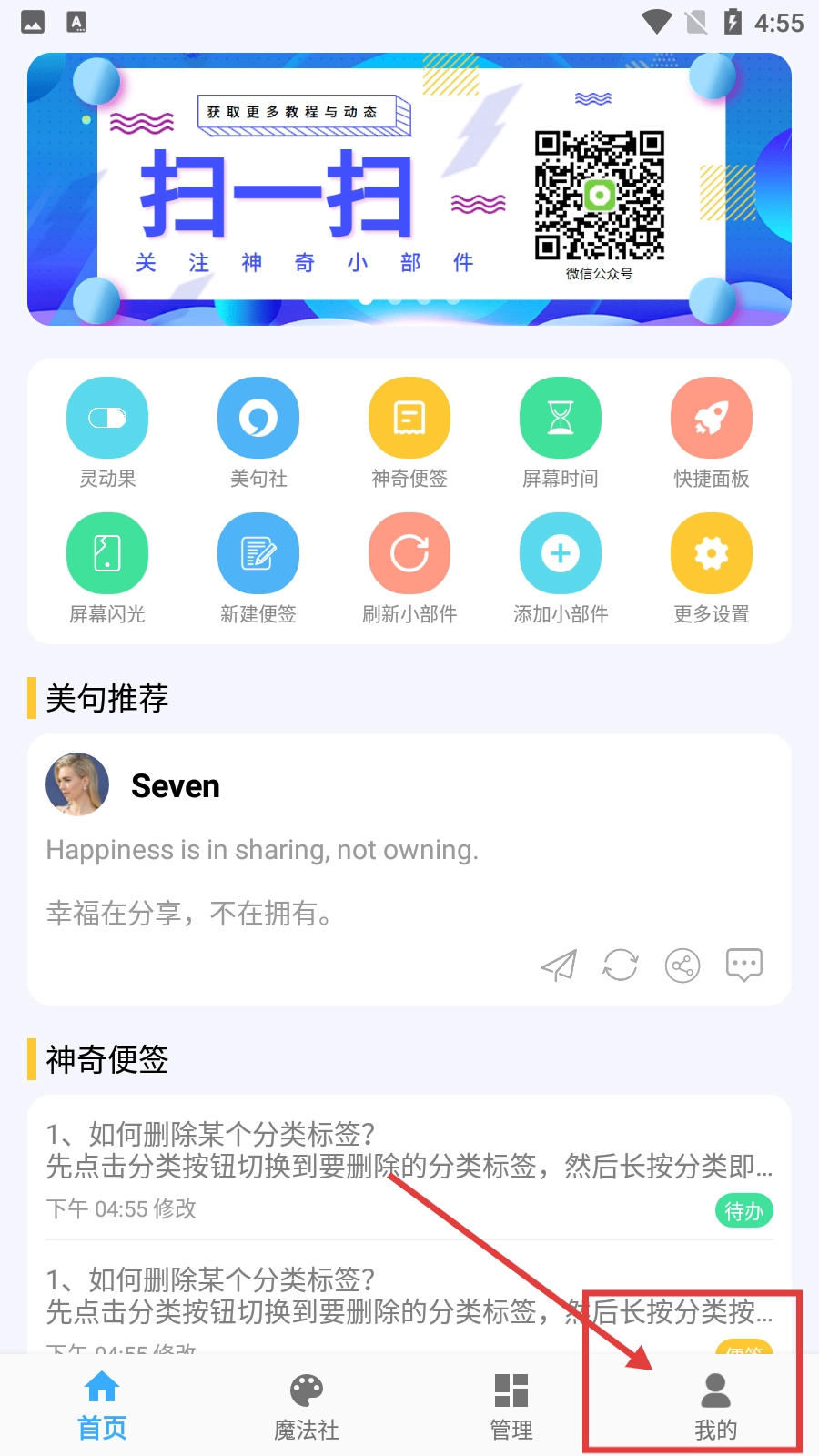 1、打開神奇小部件首頁后,點(diǎn)擊頁面右下角的【我的】按鈕,即可進(jìn)入個(gè)人中心界面。