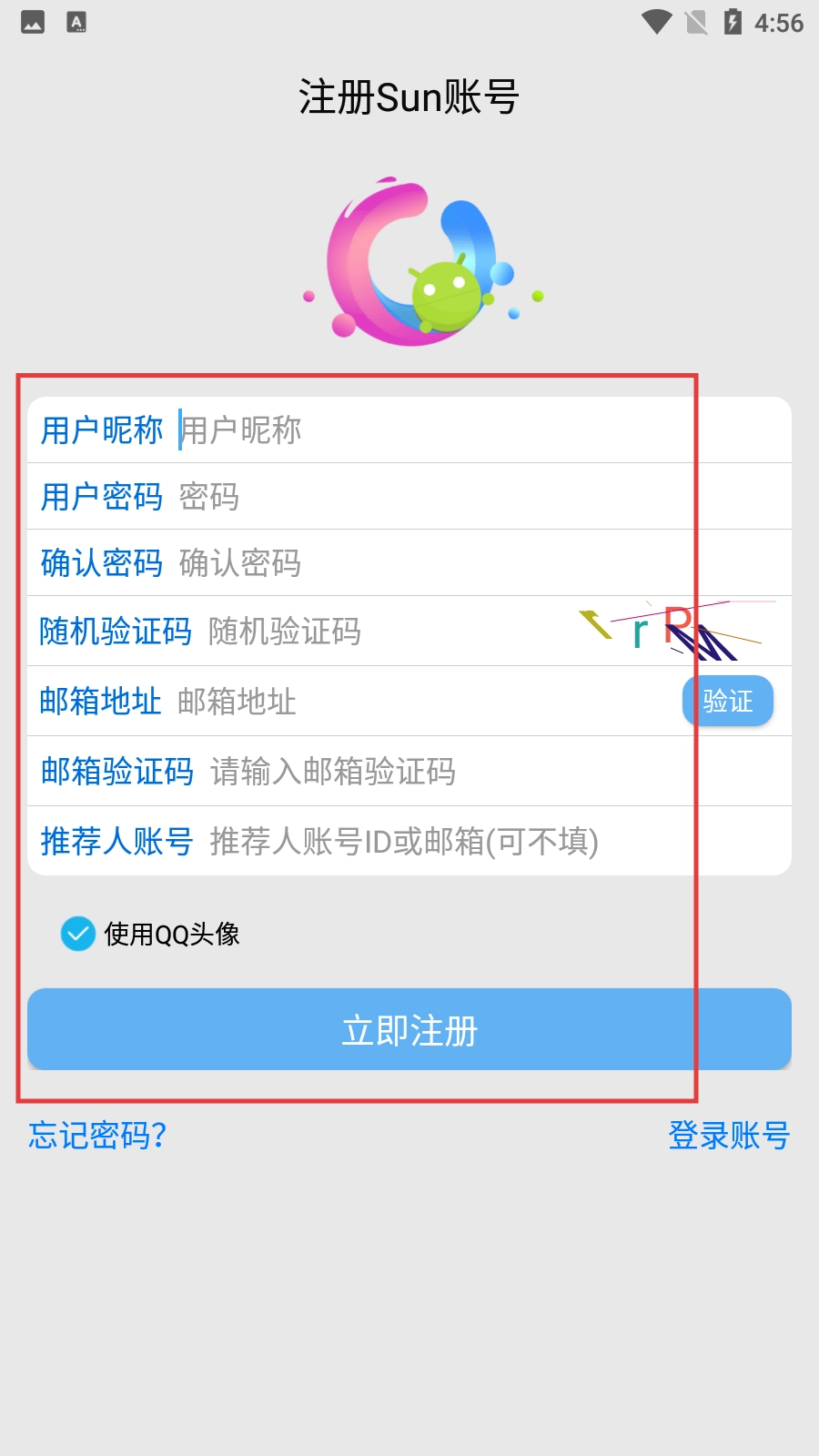 4、注冊時(shí)依次輸入用戶昵稱、密碼、確認(rèn)密碼等,勾選使用QQ頭像后點(diǎn)擊【立即注冊】完成注冊。