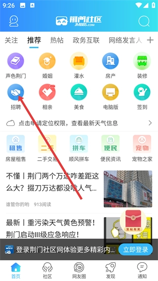 1、在荊門社區(qū)首頁找到并點(diǎn)擊【招聘】圖標(biāo),進(jìn)入荊門人才網(wǎng)頁面后,就能開展求職相關(guān)的操作了。