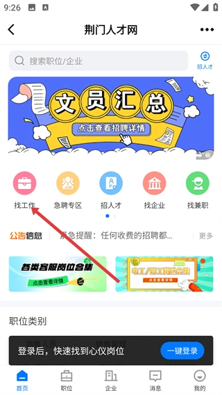 2、進(jìn)入荊門人才網(wǎng)后,點(diǎn)擊【找工作】按鈕,可查看各類職位列表。