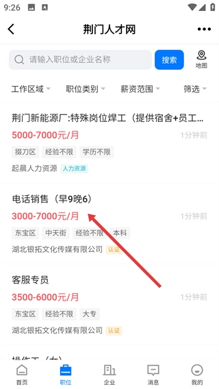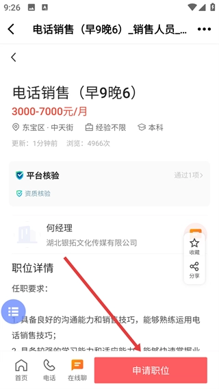 3、在職位列表中找到如【電話銷售(早9晚6)】的職位并點(diǎn)擊,可查看該職位詳細(xì)信息。